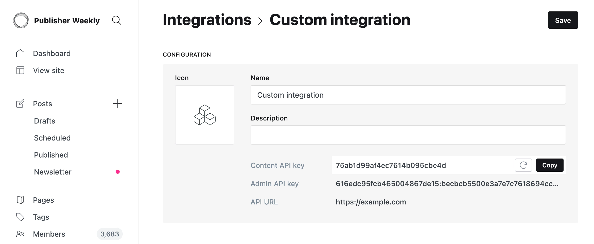 All custom integrations automatically come with Content API and Admin API keys which can be copied as soon as the integration is created. This key will give you create, access and manage content in Ghost programmatically, outside of Ghost Admin. Optionally, you can also add an icon and description of your integration for your own reference.